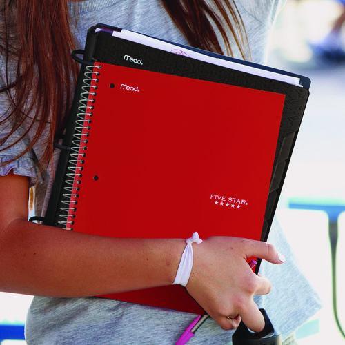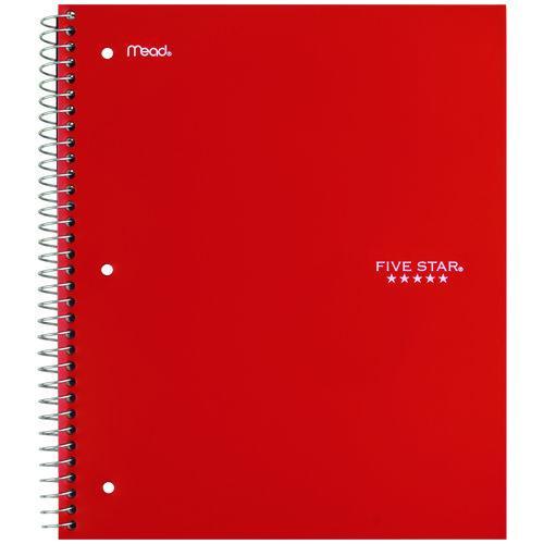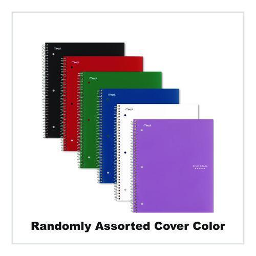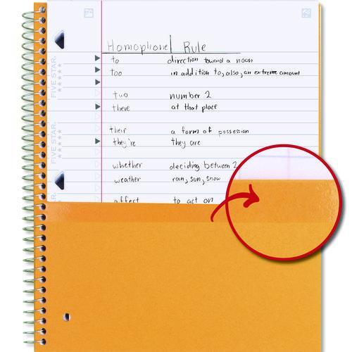 One-subject notebook features durable, water-resistant covers to keep your notes protected all year long. Wide-ruled, high-quality paper resists ink bleed to help keep your writing legible. Neat sheet pages are perforated for clean, consistent removal. Spiral lock wire prevents the coil from snagging onto your clothing. Reinforced storage pockets help prevent them from tearing out. Available in assorted colors. Color is chosen for you.
