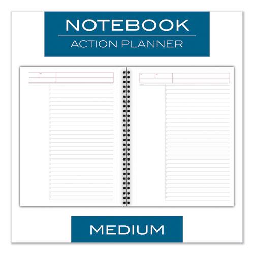Beyond everyday business note-taking, this Action Planner Notebook is formatted to help you accomplish more and meet deadlines. It's a great organizational tool for project planning, task follow-up, tracking to-do lists and more. Custom pages include designated sections for the date, project number, title, notes and actions on each page. Action section is numbered for easy organization. Action planner features 80 sheets of ruled, premium paper that is perforated for clean removal. Soft-touch cover is designed with and ultra-smooth finish and twin wire binding.