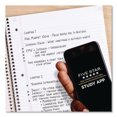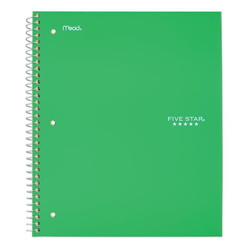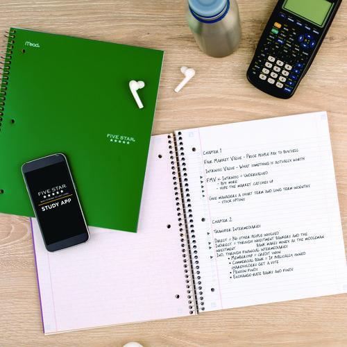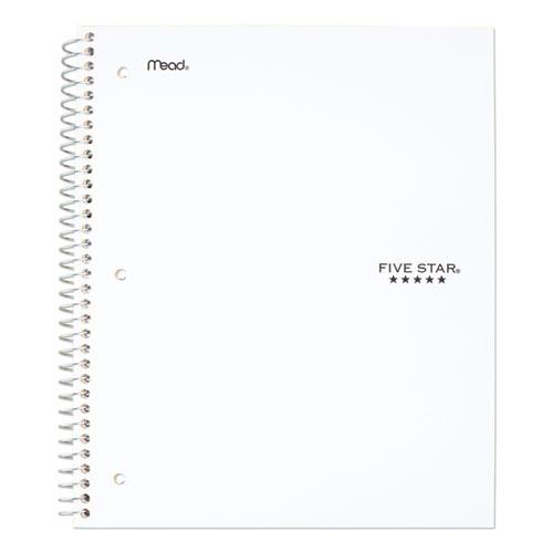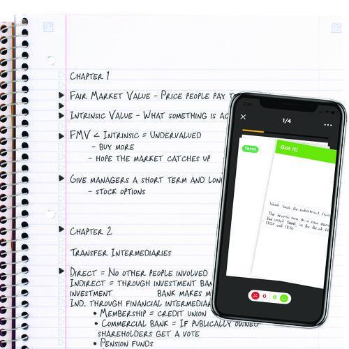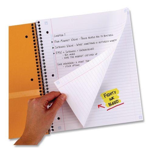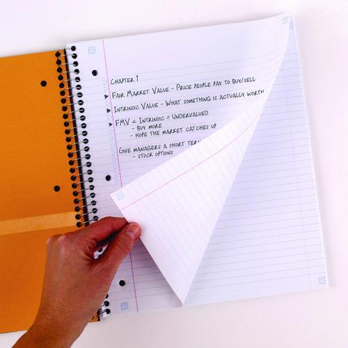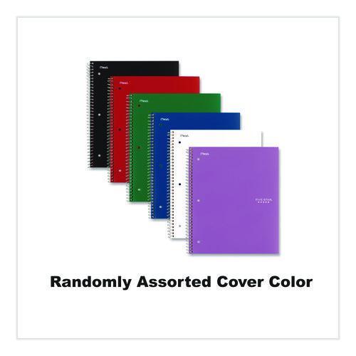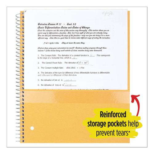 Wirebound notebook features durable poly covers in assorted colors, college-ruled white paper, stiff, heavy-duty backs. Perforated pages tear out to full size. Notebook contains full-size divider pockets.
