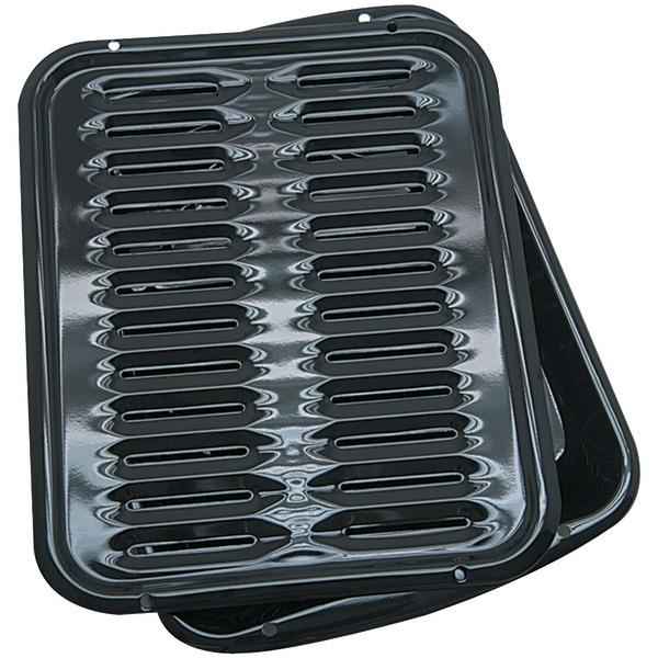 Range Kleen BP102X BP102X 2-Piece Heavy-Duty Porcelain Air Fry, Bake, and Broil Pan Ideal air fryer oven accessory; crispy, delicious results when used on air fryer oven setting; Suitable in oven, under broiler, and for use on outdoor grill; Safe for use up to 1,025deg F; Broiler pan can also be used as a baking dish; Broil healthy meals indoors; Durable, heavy-duty stick-free porcelain finish on long-lasting steel; Ideal for cooking bacon; Grate of grill allows fat and drippings to drain away from meats while bottom pan captures them; Easy to clean; dishwasher safe; 2-piece set dimensions: 16.875 in. L x 12.75 in. W x 1.75 in. D; Made in the USA;