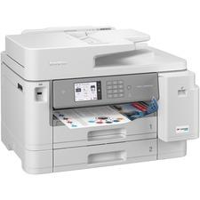 Business Color Inkjet All-in-One Printer offers efficient performance and reliable, high-quality output that is ideal for corporate home offices and small offices. Print, scan, copy and fax using this convenient printer. It features an automatic document feeder, dual 250-sheet input trays and a 3-1/2" color touch screen. Brother Maxidrive Inkjet Technology offers fast printing speeds up to 30 ppm in black or color. Maximum print resolution is 4800 x 1200 dpi for bright, vivid text or images. Print up to 11" x 17" , ledger-size documents. Copy documents using duplex copying in black or color. Maximum copy speed in black is 25 ppm and 16 ppm in color. Advanced scanning features include duplex scanning, continuous scanning, scanning preview and "scan to" features. Fax memory stores up to 150 pages. Fax in black or in color with duplex faxing. Connect using Ethernet or dual-band wireless. Printer includes starter ink cartridges.