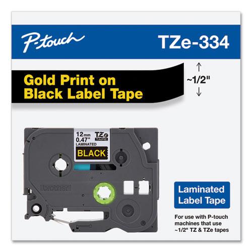 Laminated tape features standard adhesive designed for smooth, flat surfaces like office paper, file folders and binders. These labels stay on under normal indoor and outdoor use, including hot and cold environments. Use with Brother P-touch Labelers using TZ or TZe tapes. They include PT-D200, PT-D210, PT-H100, PT-1010, PT-1090, PT-1230PC, PT-1280, PT-1290, PT-1830, PT-1880, PT-2100, PT-2110, PT-2030, PT-2030AD, PT-2030VP, PT-D400, PT-D400AD, PT-D400VP, PT-D450, PT-H300, PT-H300LI, PT-2430PC, PT-2710, PT-2730, PT-2730VP, PT-D600, PT-1100, PT-1100SB, PT-1120, PT-1130, PT-1160, PT-1170S, PT-1180, PT-1190, PT-1200, PT-18R, PT-300, PT-310, PT-320, PT-1300, PT-1700, PT-1750, PT-1800, PT-1960, PT-330, PT-350, PT-520, PT-540, PT-580C, PT-2200, PT-2210, PT-2300, PT-2310, PT-2400, PT-2410, PT-2500PC, PT-2600, PT-2610, PT-3600, PT-9200DX, PT-9200PC, PT-9400, PT-9500PC and PT-9600. Print color is gold. Background is black. Tape measures 12mm (8/17") wide x 8m (26-1/5') long.