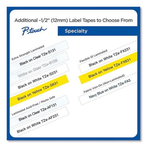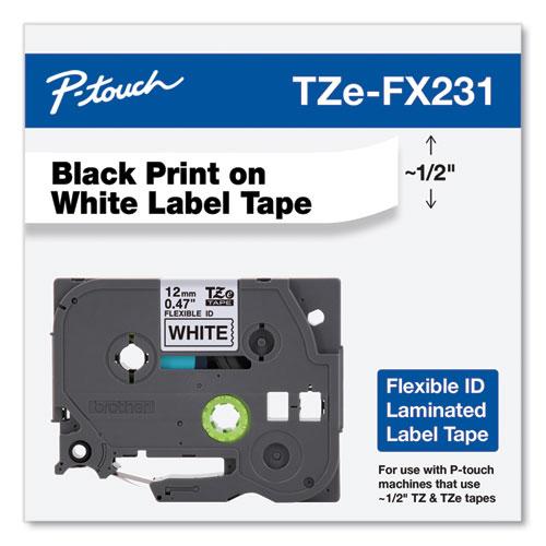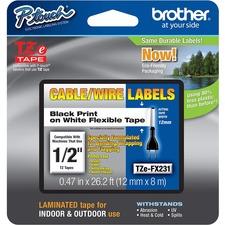 This flexible tape features Brother's exclusive laminated tape process and a specially formulated adhesive. The adhesive is designed to stick to itself as well as to laminate. Great for wrapping around an item, the tape is perfect for labeling cylindrical surfaces such as cables, PVC piping and more. It is best suited for wire wrapping and flagging. Tape is designed for use with Brother P-touch Labelers using TZ or TZe tapes. They include PT-D200, PT-D210, PT-H100, PT-1010, PT-1090, PT-1230PC, PT-1280, PT-1290, PT-1830, PT-1880, PT-2100, PT-2110, PT-2030, PT-2030AD, PT-2030VP, PT-D400, PT-D400AD, PT-D400VP, PT-D450, PT-H300, PT-H300LI, PT-2430PC, PT-2700, PT-2710, PT-2730 and PT-2730VP. Print color is black. Background is white. Tape measures 12mm (0.47") wide x 8m (26-1/5') long.