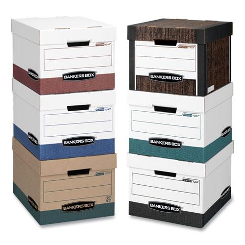 Bankers Box Heavy-Duty file storage boxes are built for archiving and high-volume document management. With stacking strength rated up to 850lbs, these cardboard file boxes with lids are engineered to protect your letter and legal-size files even in tightly packed storage rooms. Reinforced handles and rugged construction make them easy to carry and dependable under pressure. Ideal for those who need long-term storage that won't buckle or break, these boxes deliver unmatched durability and professional-grade performance. Made in the en_USA with 60% recycled materials, they combine strength, sen_UStainability, and smart design. Box inside dimensions: 12 x 10 x 15 Inches.