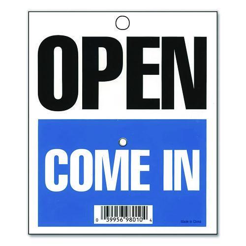 Sign reads "Open" in bold, capitalized letters on one side and welcomes customers with a "Come in" written in white on a blue background. The other side reads, "Will Return," and features a clock with movable red hands to let you customize the time of your return. Sign is made of thick plastic.