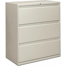 Three-drawer lateral file offers clean lines, reinforced case construction, 36" width, dual side locks for security, and full-width, designer-style handles. Baked enamel finish over rust-inhibiting, phosphate pretreatment adds more durability. Three-part, telescoping, ball-bearing suspension delivers smooth drawer operation. Drawers accommodate letter-size or legal-size folders from side-to-side with included adjustable hangrails. Drawers are flush at the top and sides and feature drawer-extension restraint. Mechanical interlock allows only one drawer to open at a time. Light gray lateral file also offers four adjustable leveling guides for stabilizing and HON One Key interchangeable, core-removable lock. Lock mechanism secures both sides of drawers.